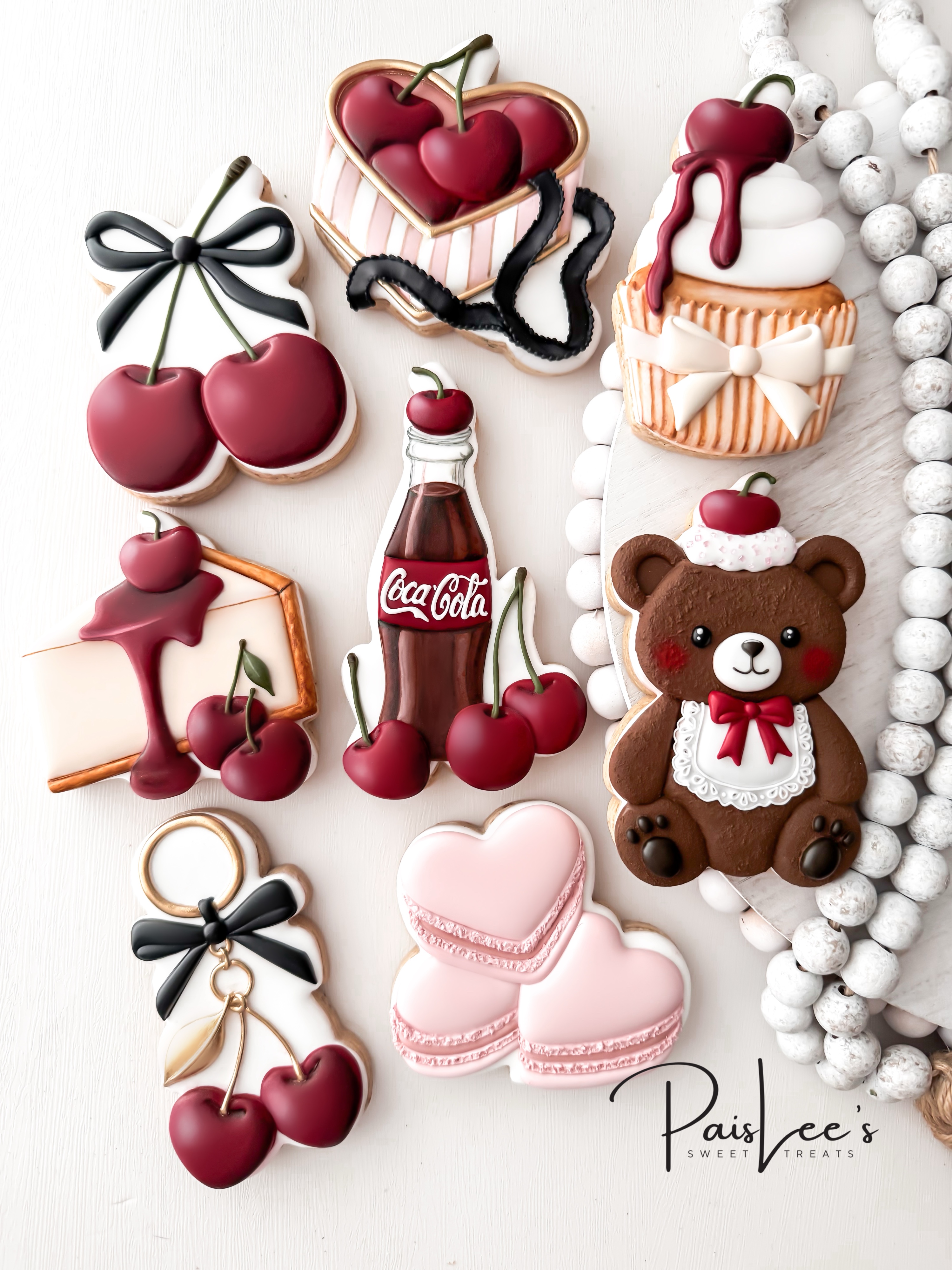 Join my Valentine’s Day cookie class and learn fun, creative techniques, including hand painting to achieve realistic details. You’ll decorate beautiful red cherries, a sweet teddy bear with a cherry on top, cherry cupcake and cheesecake, a classic Coca Cola bottle, a cherry keychain with gold detailing, a heart cherry box filled with cherries, and stacked heart shaped macarons. Perfect for all skill levels!