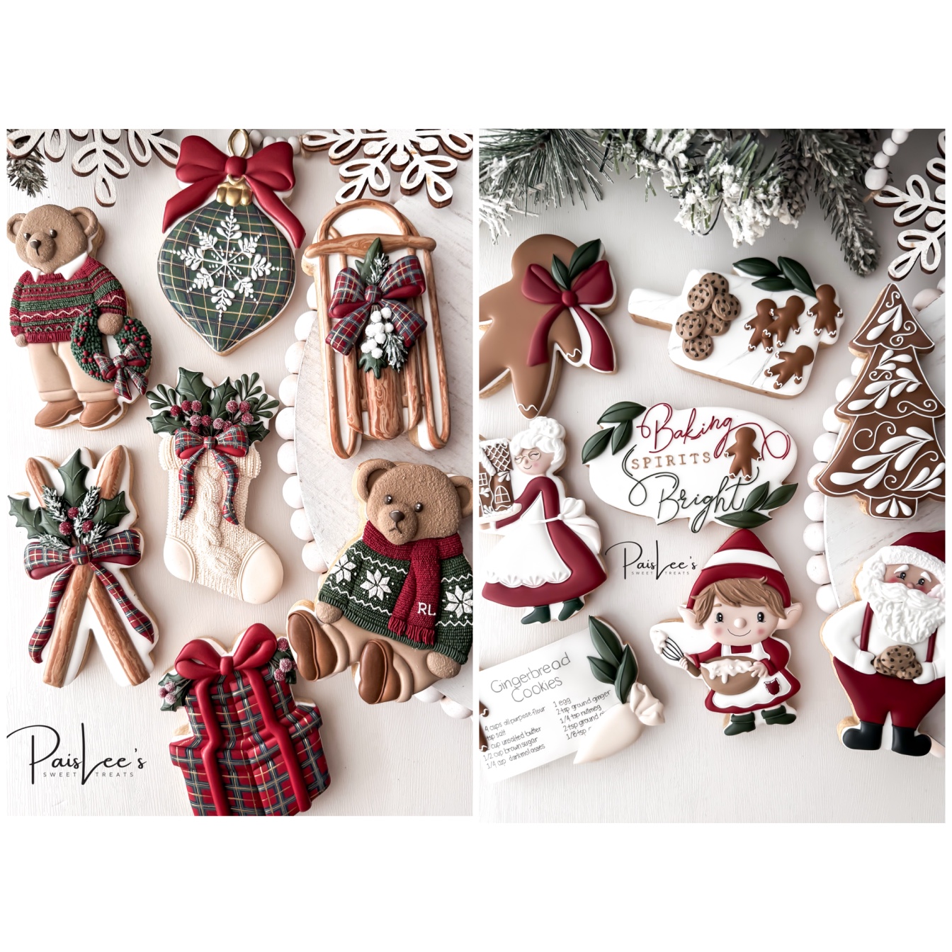 Baking Spirits Bright Cookie Class Embrace the joy of the holiday season with this enchanting cookie class. Unleash your creativity as you craft an array of festive delights, including a Santa Claus, a Mrs. Claus, & a delightful elf. A gingerbread tree with intricate white scrollwork, & assemble a cookie platter adorned with greenery. Complete the experience with a gingerbread recipe card made from wafer paper & more
