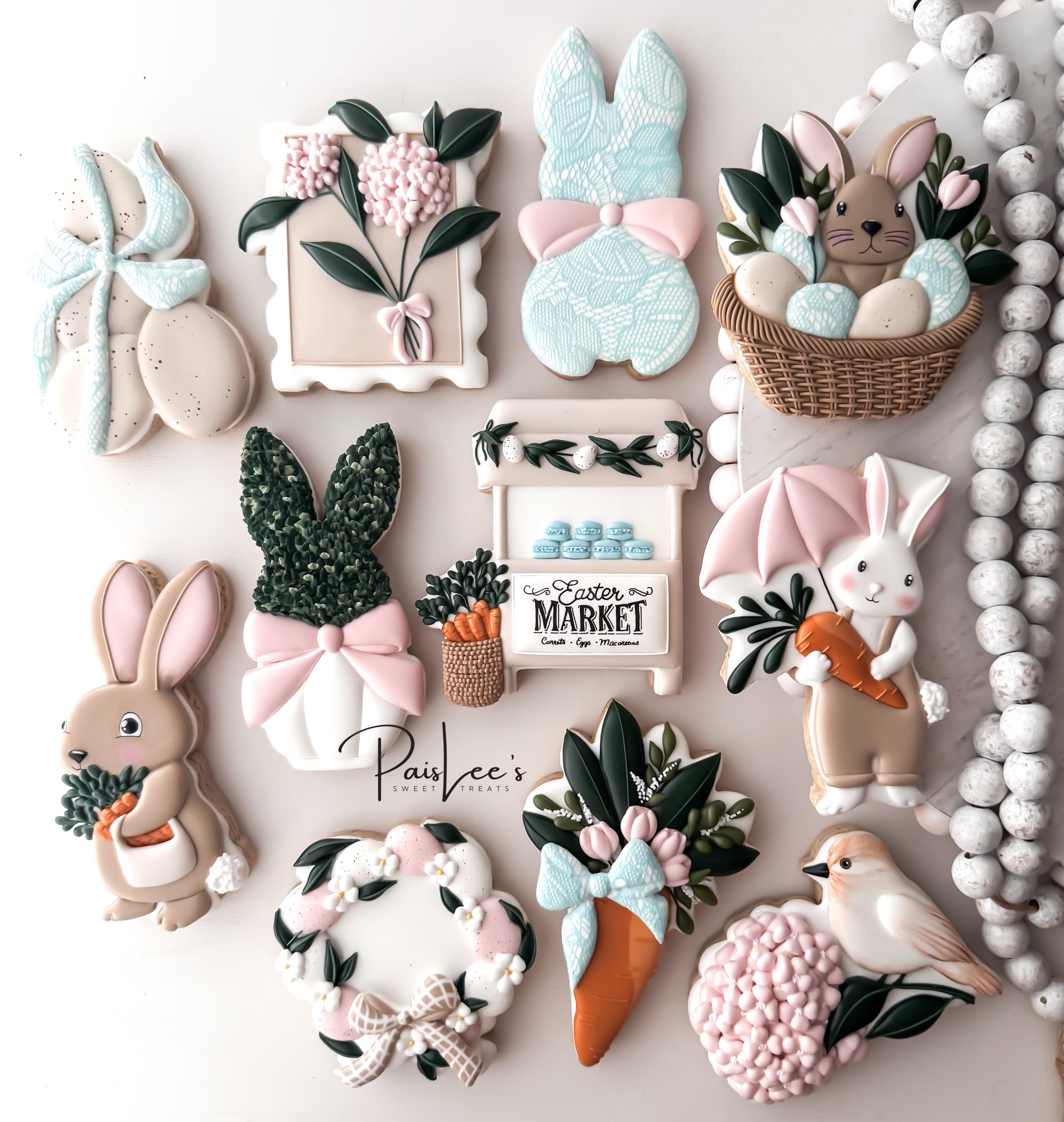 Discover the joy of Easter decorating in my Hop into Spring cookie class! Learn to create stunning turquoise lace techniques, including a lace bunny & delicate bows, plus an adorable Easter market cart with carrots & stacked macarons. You’ll design three Easter bunnies, basket weaving details, a sweet bird with hydrangeas, florals, greenery, wreaths, & charming spring designs using beautiful decorating techniques.