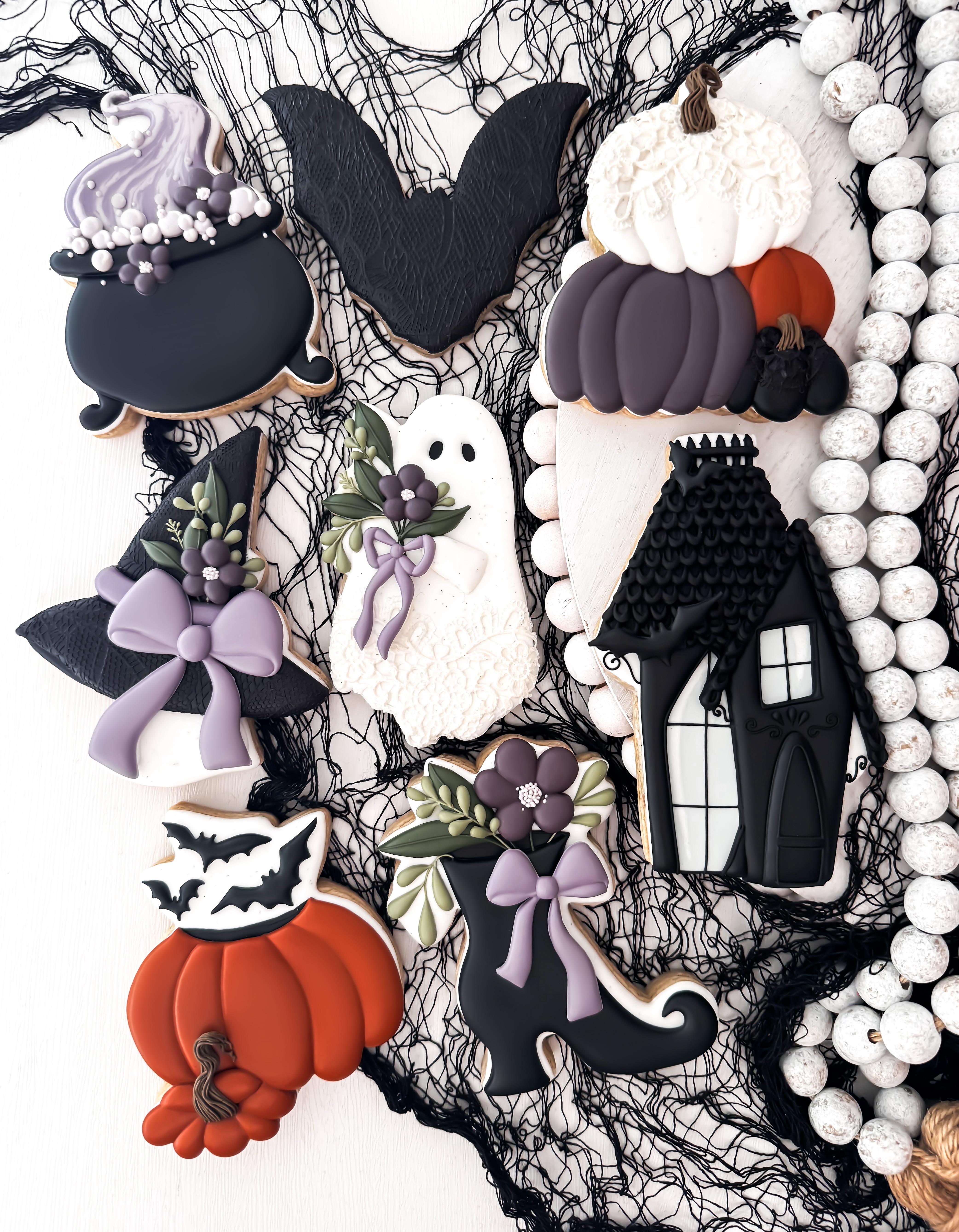 Introducing my Halloween-themed "Laced with Love" cookie class! Explore fun, new techniques like edible lace, pumpkins with bats, a witches' boot with floral detail, a witches' hat, a spooky cauldron, and more. This class is a must-try for cookie enthusiasts seeking a delightfully haunting experience. Join me for an evening of creativity & Halloween delight!Get ready for a wickedly good time in "Laced with Love"!