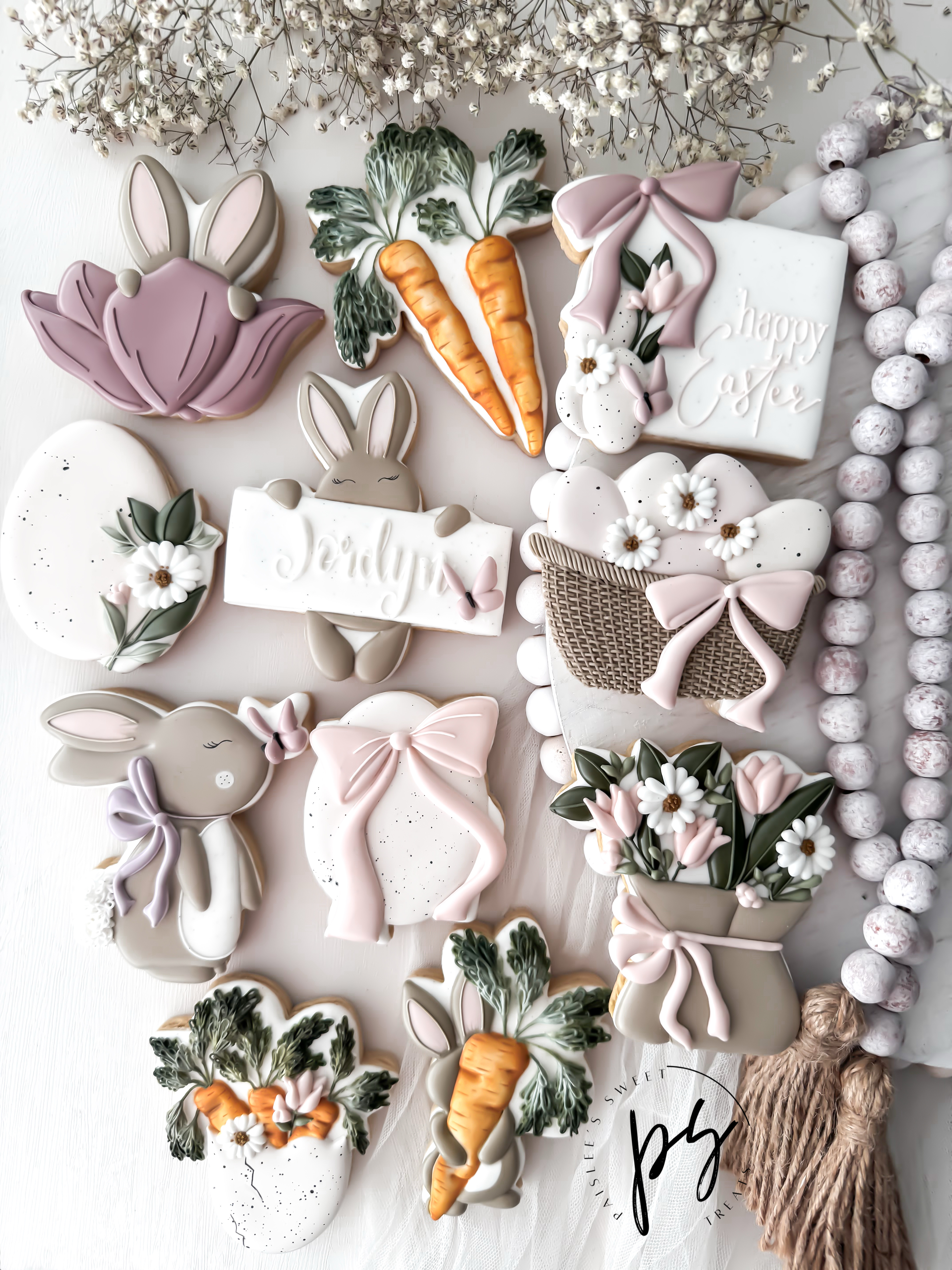 Hop into creativity with my new "Spring into Easter" cookie class! I'm thrilled to collaborate with the talented Hannah. Exciting news: I'm offering 11 cookies for the price of 6! Master techniques like hand-painted carrots, floral Easter plaques, egg baskets with weaving patterns, bunny cookies with butterfly transfers, & stunning bow transfers. Join me for a sweet and artistic Easter adventure!
