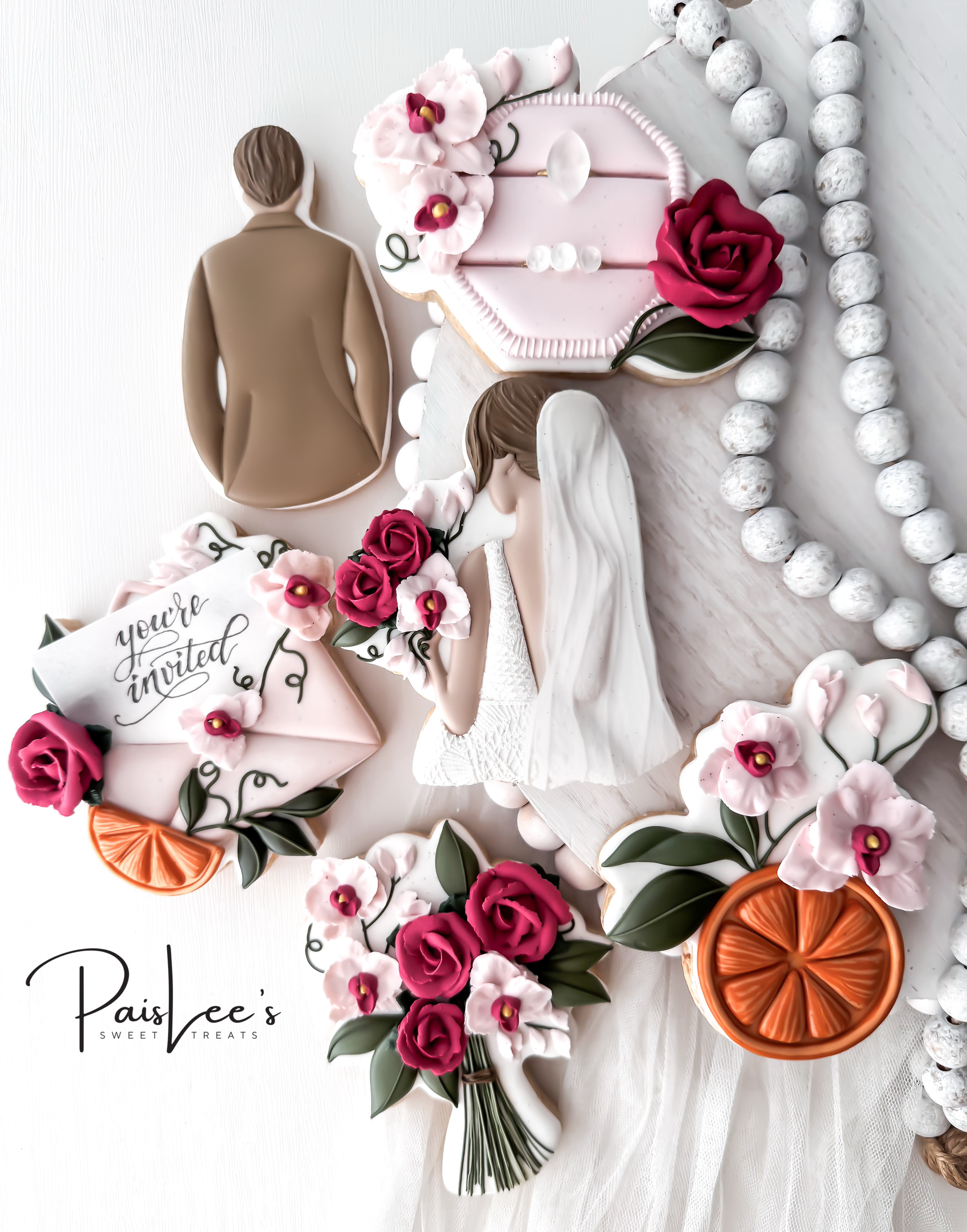 The citrus bridal cookie class teaches techniques like isomalt diamonds, wafer paper, floral transfers, & intricate lace work. You'll create a bridal ensemble including a bride, groom, bouquet, ring box, invitation, & citrus plaque with orchids. This class is a must-attend for aspiring cookie artists looking to expand their skill set & create breathtaking bridal-inspired confections with delicate lace accents.